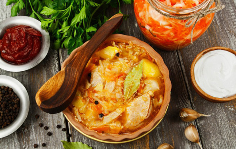 Shchi - súp cải bắp nấu kiểu Nga cũng được xem như món ăn truyền thống của xứ sở Bạch Dương. Là món ăn rất giàu dinh dưỡng với thành phần cà rốt, việt quất để thưởng thức vào mùa đông.