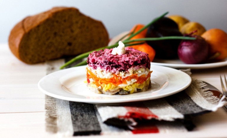 Đến Nga mà không thử món salad đặc trưng được xem như các cổ động viên yêu bóng đá đã mua vé xem World Cup vô ích. Đây là loại salad truyền thống của người dân xứ sở Bạch Dương. Thành phần bao gồm: Khoai tây, cà rốt, đậu Hà Lan, dưa chua, ngoài ra có thể thêm cua và trứng cá hồi. Món ăn này được trình bày rất đẹp mắt với nhiều lớp nguyên liệu xếp chồng lên nhau.