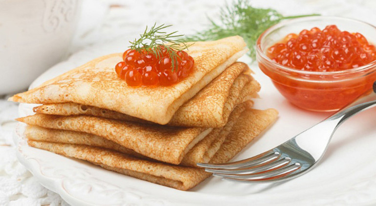 Được mệnh danh là món ngon đặc biệt ở nước Nga, du khách không thể bỏ qua loại bánh pancake làm từ lúa mì, kiều mạch và bột yến mạch. Bánh có nhiều lớp với các loại nhân khác nhau như kem chua, mứt, mật ong hoặc trứng cá hồi muối.