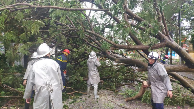 Cán bộ, chiến sĩ Tiểu đoàn Cảnh sát đặc nhiệm - Trung đoàn Cảnh sát cơ động Công an thành phố trên đường làm nhiệm vụ trở về doanh trại gặp nhiều cây đổ chặn lối đi, đã phối hợp cùng lực lượng 113 dọn cây mở lối đi cho người dân.