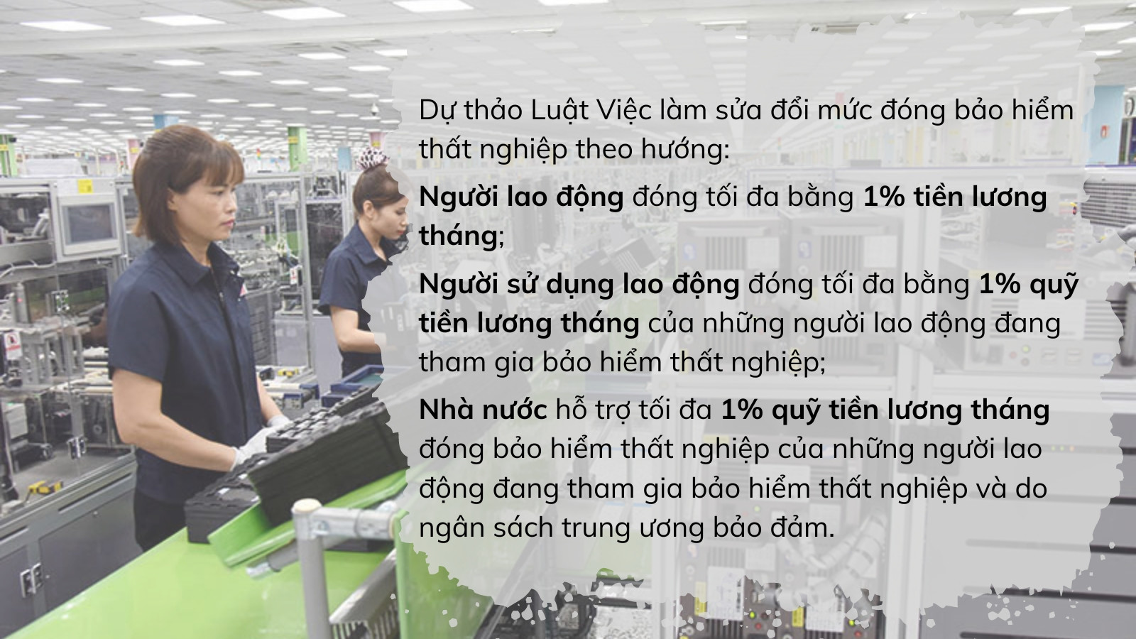 Dự thảo Luật Việc làm sửa đổi mức đóng bảo hiểm thất nghiệp theo hướng: Người lao động đóng tối đa bằng 1% tiền lương tháng; Người sử dụng lao động đóng tối đa bằng 1% quỹ tiền lương tháng của những người lao động đang tham gia bảo hiểm thất nghiệp; Nhà nước hỗ trợ tối đa 1% quỹ tiền lương tháng đóng bảo hiểm thất nghiệp của những người lao động đang tham gia bảo hiểm thất nghiệp và do ngân sách trung ương bảo đảm.