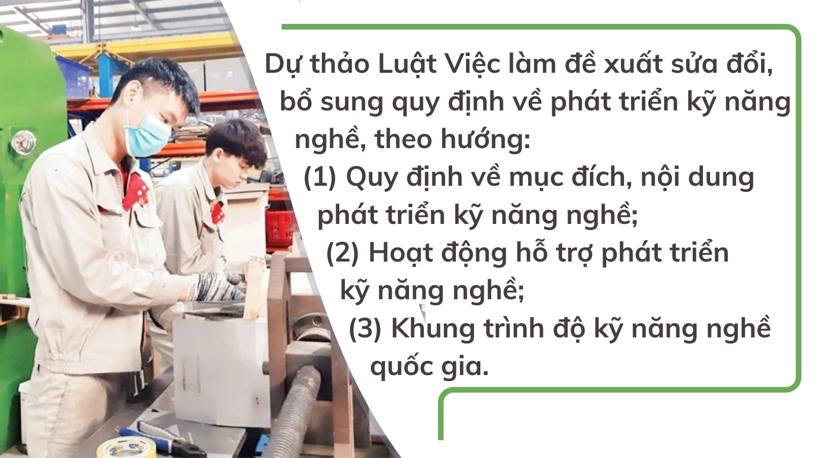 Do đó, dự thảo Luật Việc làm đề xuất sửa đổi, bổ sung quy định về phát triển kỹ năng nghề, theo hướng: (1) Quy định về mục đích, nội dung phát triển kỹ năng nghề; (2) Hoạt động hỗ trợ phát triển kỹ năng nghề; (3) Khung trình độ kỹ năng nghề quốc gia.