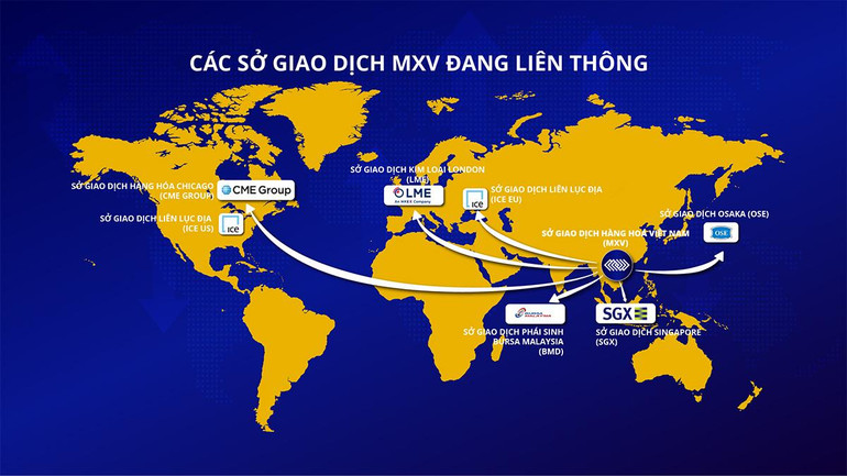 Sau 12 năm thành lập và phát triển, hiện nay MXV đang liên thông với hầu hết các Sở Giao dịch lớn nhất trên thế giới như: Sở Giao dịch Hàng hóa Chicago (CME Group), Sở Giao dịch Kim loại London (LME), Sở Giao dịch Liên lục địa (ICE), Sở Giao dịch Singapore (SGX), Sở Giao dịch Osaka (OSE), Sở Giao dịch Phái sinh Bursa Malaysia (BMD).