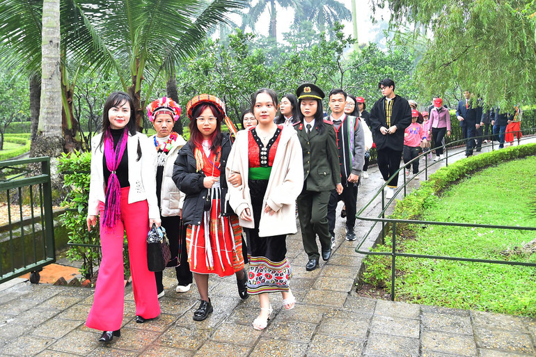 | Các em học sinh, sinh viên, thanh niên dân tộc thiểu số thăm Nhà sàn Bác Hồ. |