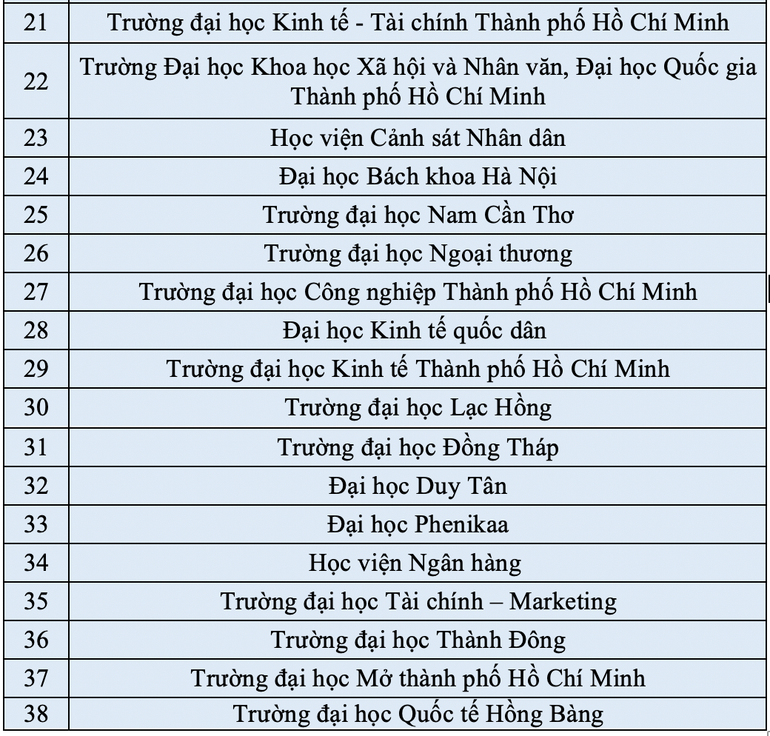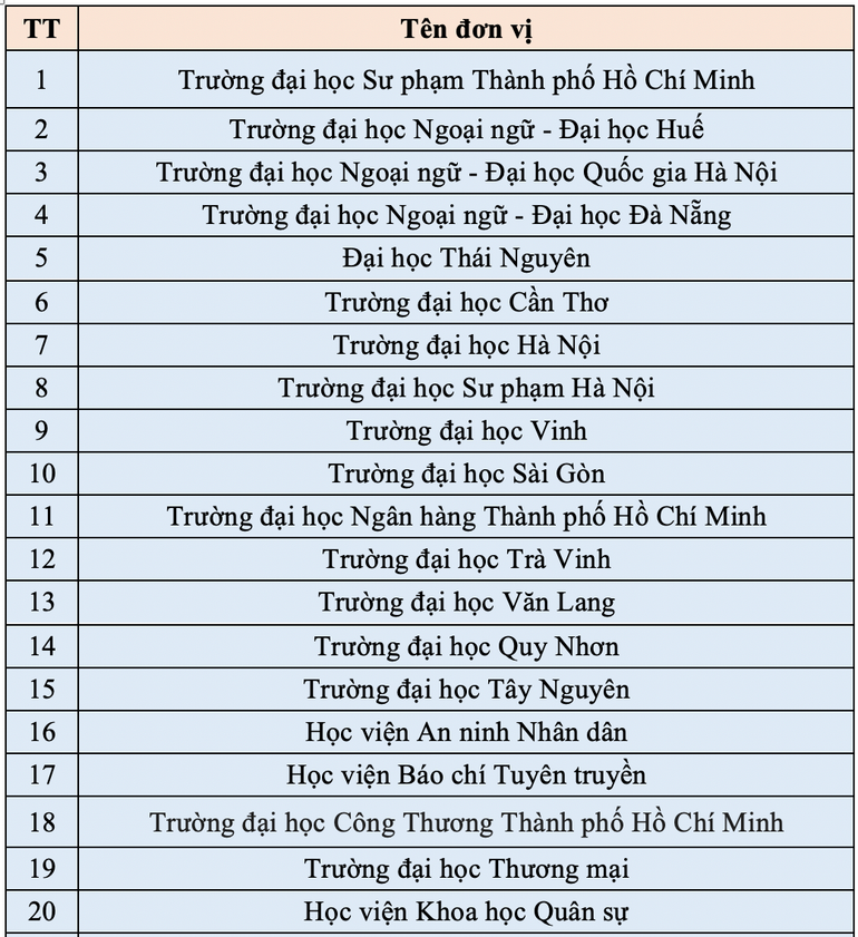 Theo danh sách, có 38 đơn vị là các đại học, học viện, trường đại học trong cả nước đủ điều kiện tổ chức thi đánh giá năng lực tiếng Anh theo Khung năng lực ngoại ngữ 6 bậc dùng cho Việt Nam, cụ thể như sau: