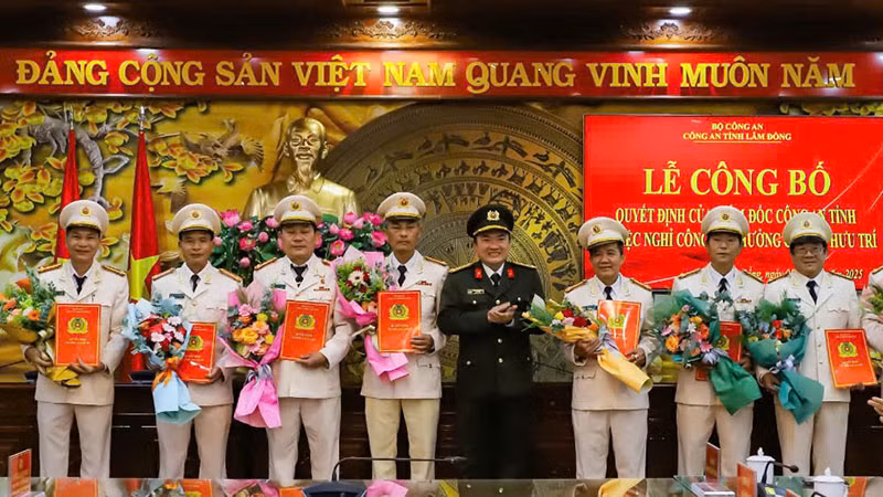 | Lãnh đạo Công an tỉnh Lâm Đồng trao quyết định cho các đồng chí nghỉ hưu. |