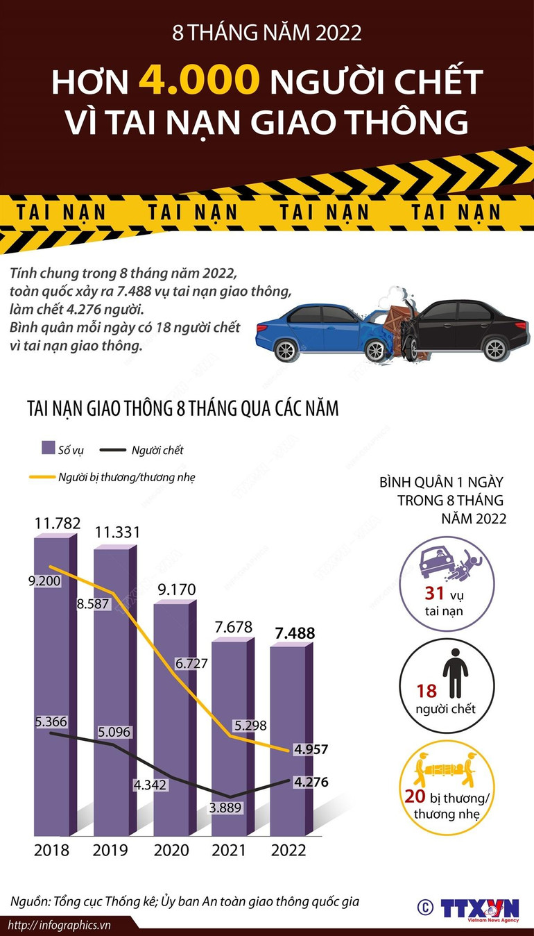 Tính chung trong 8 tháng năm 2022, toàn quốc xảy ra 7.488 vụ tai nạn giao thông, làm chết 4.276 người. Bình quân mỗi ngày có 18 người chết vì tai nạn giao thông.