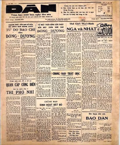 Khi đó, Xứ ủy Trung kỳ vận động một số dân biểu tiến bộ đứng ra xin phép xuất bản tờ báo lấy tên là Dân. Ngày 6-7-1938, số 1 báo Dân ra mắt bạn đọc, số lượng ban đầu 5.000 tờ, phát hành chủ yếu ở Huế, miền Trung và cả nước; báo ra được 17 số thì ngày 7-10-1938 bị chính quyền Nam triều và Bảo hộ lấy lý do “đăng tin không thiệt” để ra lệnh đóng cửa.