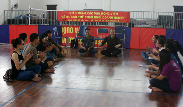 Không khó để tìm ra nơi tập chèo của nhóm bạn trẻ thuộc dự án Chèo 48h – Tôi chèo về quê hương. Trời nắng đổ lửa, dưới cái nóng hầm hập của khu thể chất ĐH Sân khấu Điện ảnh mà hai chiếc quạt công nghiệp không đủ để xua đi, khoảng gần hai chục bạn học sinh, sinh viên say sưa với những làn điệu trong trích đoạn chèo dân gian “Xã trưởng – Mẹ Đốp”. Nhạc cụ được sử dụng duy nhất là chiếc trống chèo. Sân khấu là khoảng sàn tập thể thao, được quy ước như một chiếc chiếu chèo.