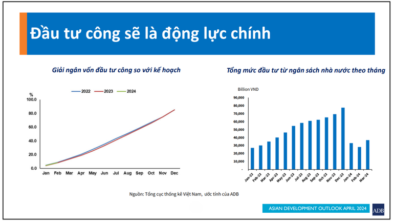 Cũng theo chuyên gia ADB, năm 2024, đầu tư công sẽ tiếp tục đóng vai trò quan trọng trong việc hỗ trợ nền kinh tế. Là một động lực cho tăng trưởng kinh tế của Việt Nam, việc triển khai hiệu quả đầu tư công có ý nghĩa quan trọng để thúc đẩy tăng trưởng.