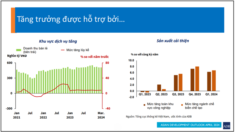 ADB nhận định, nhu cầu toàn cầu suy giảm và lãi suất quốc tế cao đã tác động đến tăng trưởng của Việt Nam trong năm 2023. Tuy nhiên, việc chuyển hướng nhanh chóng sang chính sách tiền tệ hỗ trợ tăng trưởng và đầu tư công quy mô lớn là một trong những biện pháp then chốt được thực hiện để duy trì phục hồi tăng trưởng trong năm 2023.