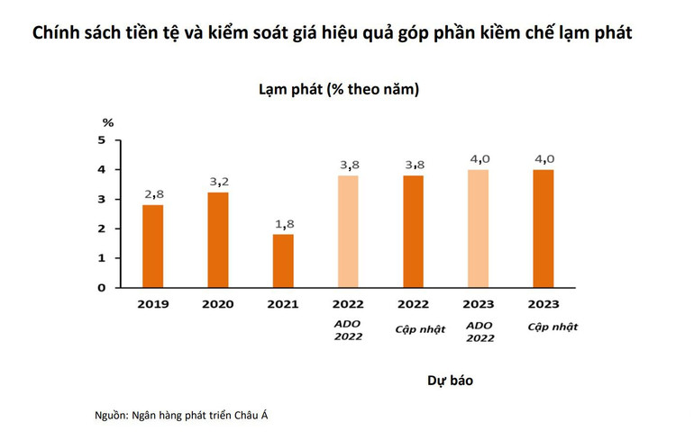 Lạm phát tăng cao ở Mỹ và Liên minh châu Âu làm gia tăng áp lực lạm phát trong nước. Tuy nhiên, chính sách tiền tệ thận trọng của Việt Nam và việc kiểm soát giá hiệu quả, đặc biệt đối với các mặt hàng xăng dầu, giúp kiềm chế lạm phát ở mức 3,8% năm 2022 và 4,0% năm 2023, không thay đổi so với dự báo đã đưa ra trong báo cáo “Triển vọng phát triển châu Á” công bố vào tháng 4/2022.