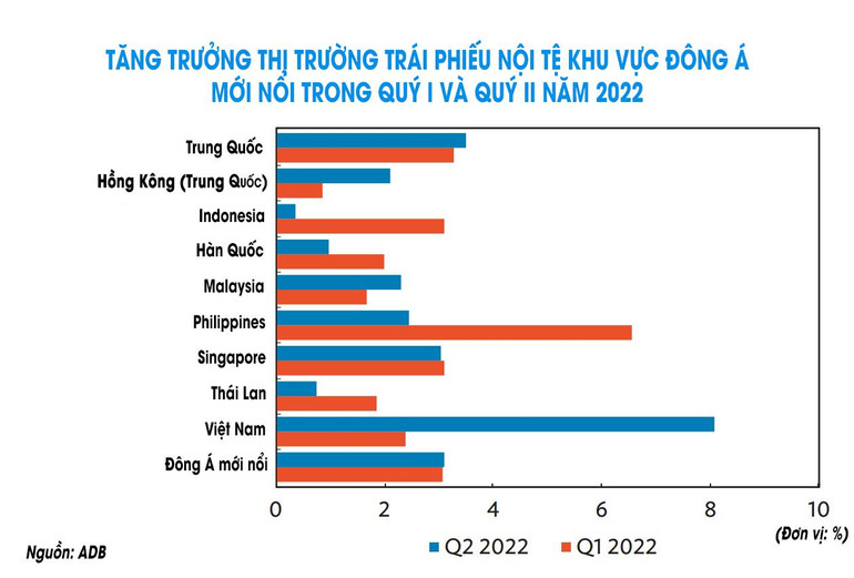 Báo cáo Giám sát trái phiếu châu Á được ADB công bố ngày 14/9 cho thấy, trong giai đoạn từ ngày 15/6 tới 24/8, thị trường trái phiếu bằng đồng nội tệ của Việt Nam tăng 8,1% so với quý trước (2,4%), đạt giá trị 99,5 tỷ USD. Đây là mức tăng mạnh nhất trong nhóm các quốc gia và vùng lãnh thổ thuộc khu vực Đông Á mới nổi.