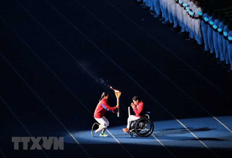 Ngọn đuốc ASEAN Para Games 12 được các vận động viên tiêu biểu của Campuchia rước quanh sân vận động quốc gia Morodok Techo.