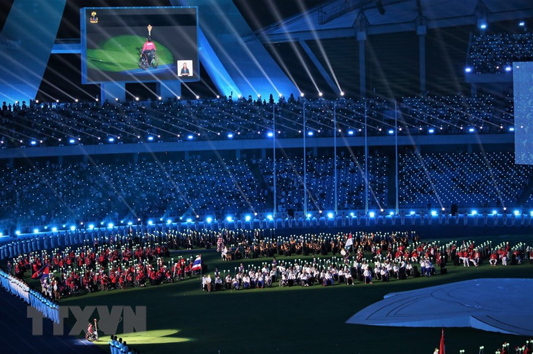 Ngọn đuốc ASEAN Para Games 12 tiếp tục di chuyển trên đường piste quanh sân vận động quốc gia Morodok Techo.