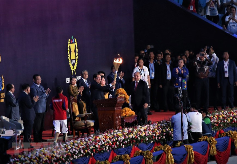 Nghi thuốc thắp sáng ngọn đuốc trên đài đuốc sân vận động quốc gia Morodok Techo.