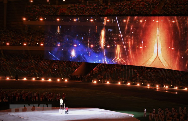 Nghi thức thắp sáng ngọn đuốc trên sân vận động quốc gia Morodok Techo.