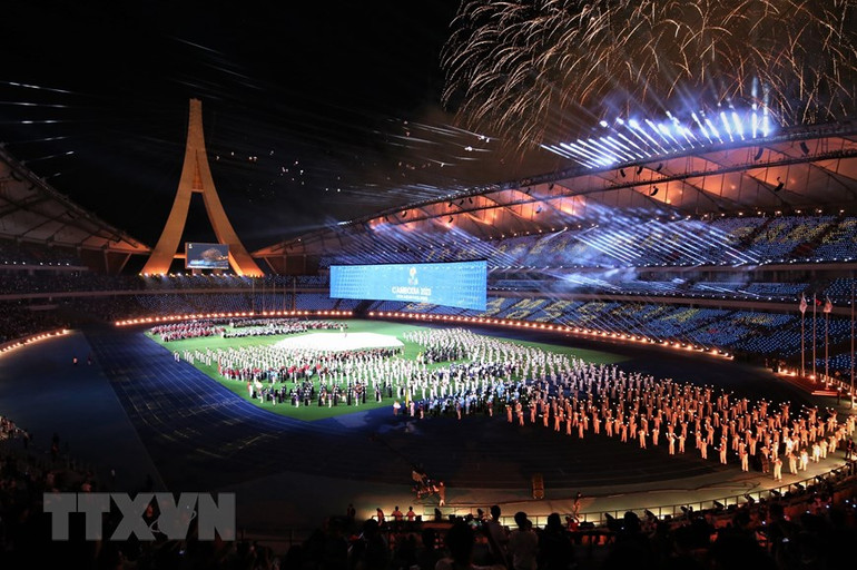 Màn pháo hoa rực rỡ trên bầu trời sân vận động quốc gia Morodok Techo trong đêm khai mạc ASEAN Para Games 12.