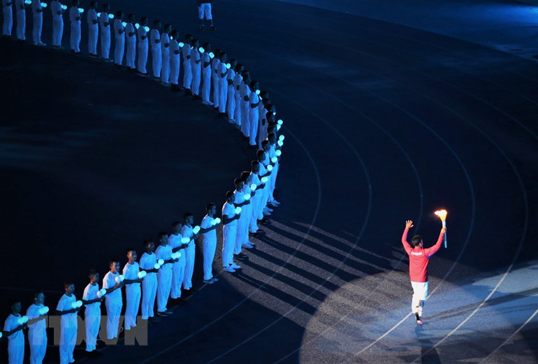 Vận động viên Vat Chanthan di chuyển ra khu vực đường piste để trao đuốc cho vận động viên tiếp theo.