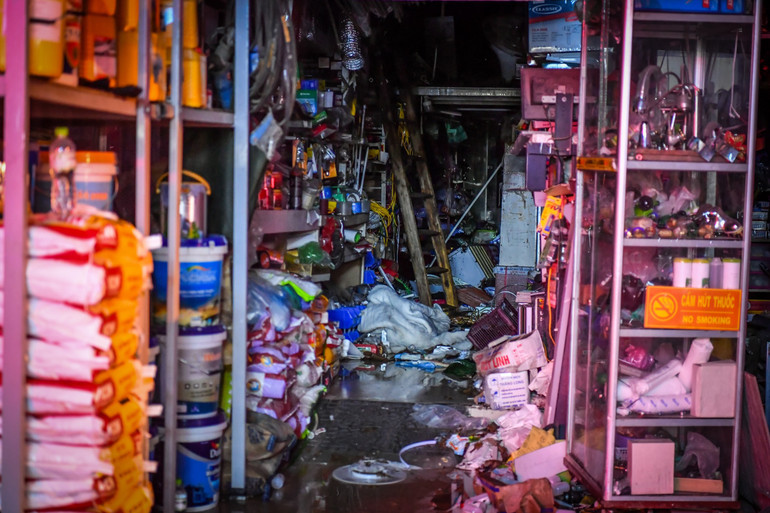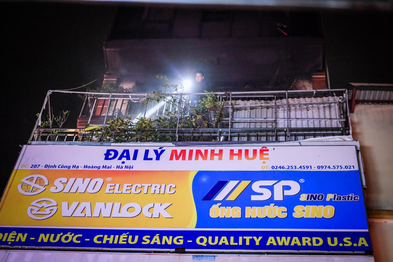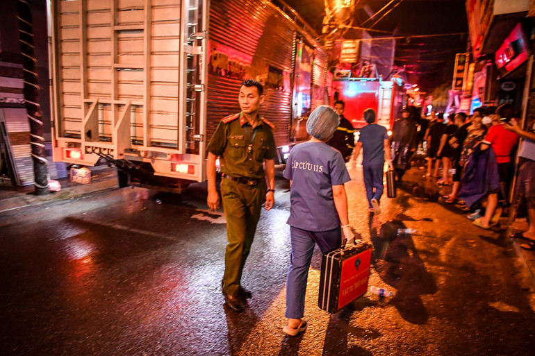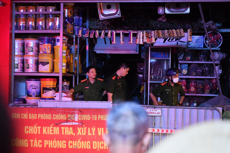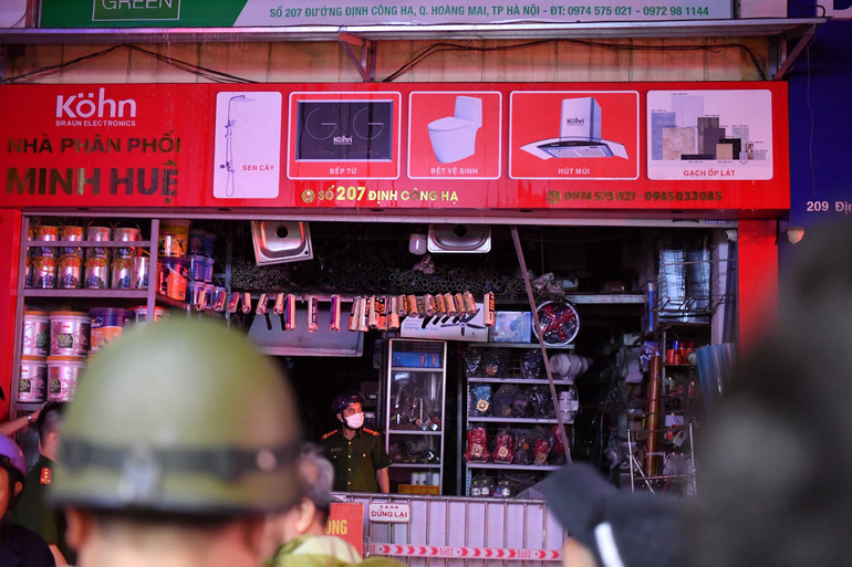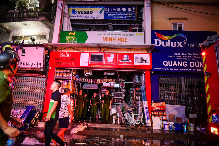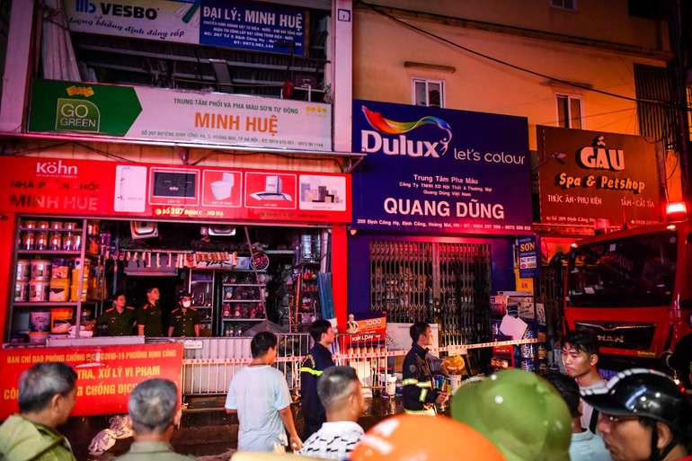 Tới thời điểm 23 giờ 30 phút, cảnh sát vẫn có mặt tại hiện trường vụ cháy trên phố Định Công Hạ, phường Định Công, quận Hoàng Mai, Hà Nội.
