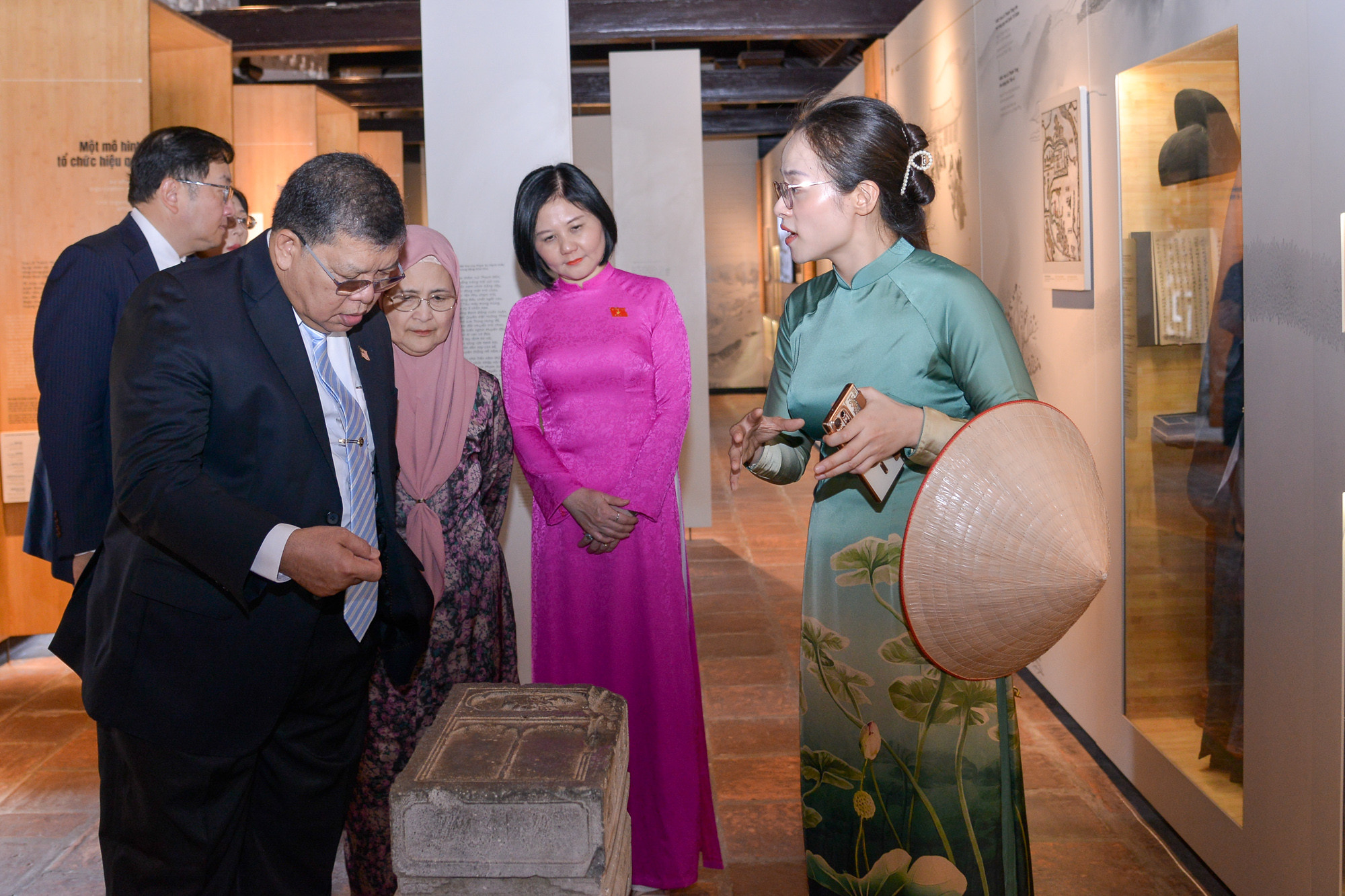| Chủ tịch Hạ viện Malaysia Tan Sri Dato’ Johari Bin Abdul và Phu nhân cùng Đoàn chiêm ngưỡng các hiện vật trưng bày tại Văn Miếu-Quốc Tử Giám. |
