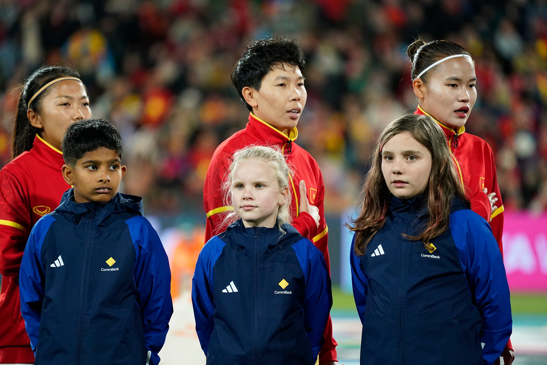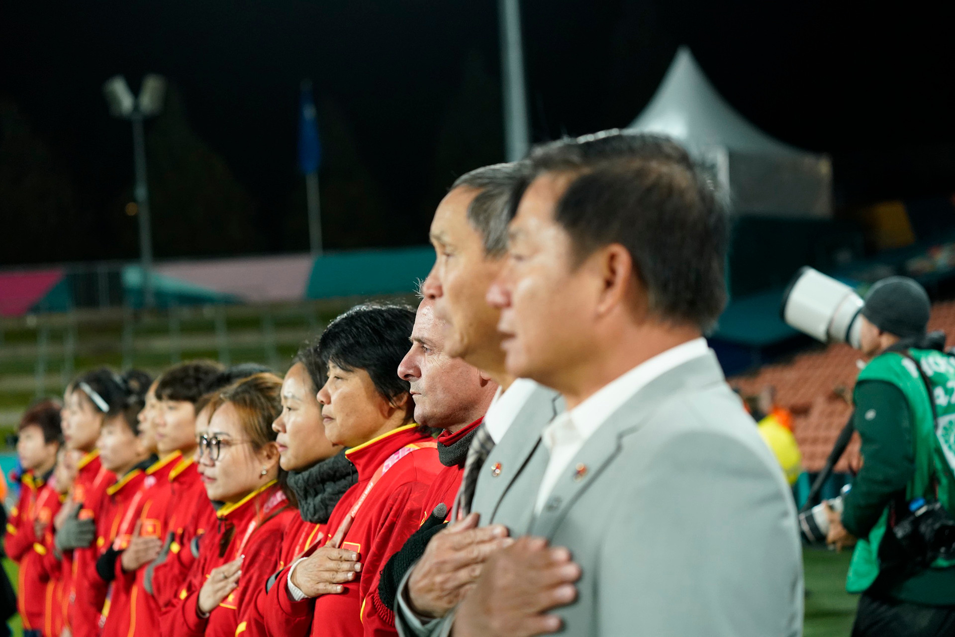 | Đội tuyển nữ Việt Nam thực hiện nghi thức chào cờ trên sân vận động Waikato. |