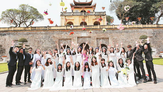 Sớm chủ nhật đầu tháng 11, trời mưa lại thêm chút se lạnh vậy mà lớp 12N1 Trường THPT Việt Đức vẫn cố gắng có mặt đầy đủ, hối hả trang điểm. Em Bùi Ánh Dương, lớp phó học tập tâm sự: “Từ 5 giờ sáng nay mọi người đã tụ tập lại chuẩn bị cùng nhau nhưng vì mưa nên phải bắt ta-xi tới trường rồi mới trang điểm và thay áo dài”. Không phụ lòng mong đợi của cả lớp, sau một tiếng chụp ảnh trong phòng học, gần 10 giờ, trời chuyển trong xanh. Cả lớp reo hò vui sướng, ai cũng cười tươi rạng rỡ. Cả ngày các bạn phải chạy xô liên tục, từ trường học tới Hoàng thành Thăng Long và kết thúc bằng những bức ảnh tinh nghịch khi mọi người tung bột mầu ở công viên Yên Sở.