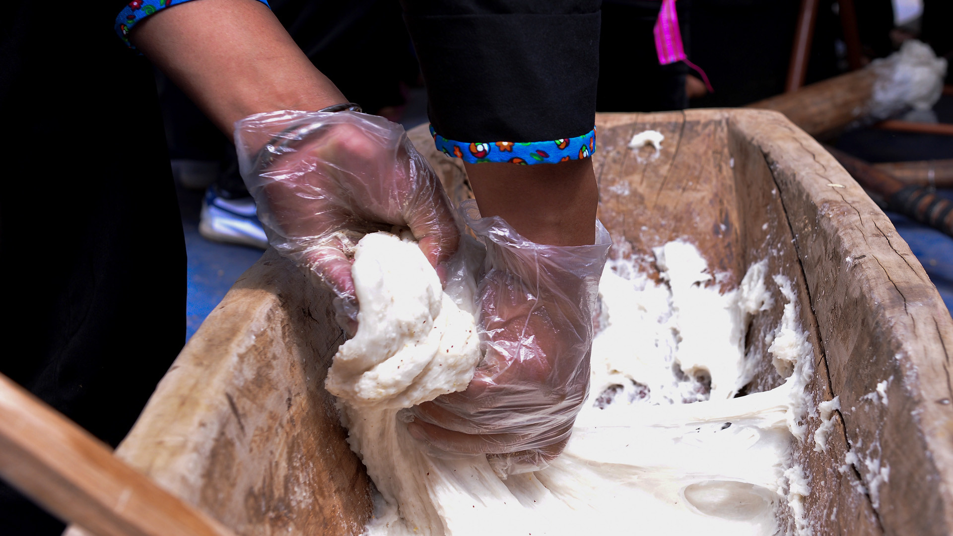 | Xôi chín sẽ được bà con đưa vào cối để chuẩn bị giã . |