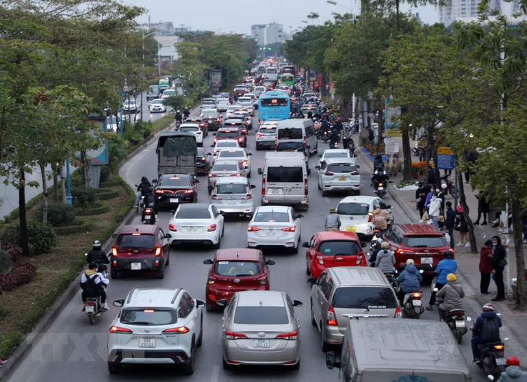 Đường Cổ Linh (Long Biên) đón lượng người và phương tiện tăng đột biến. (Ảnh: Hoàng Hiếu/TTXVN)
