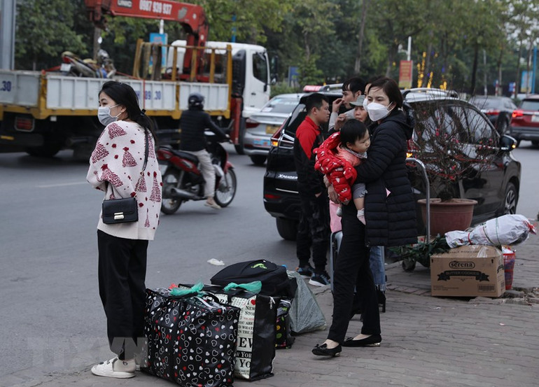 Người dân với vali, túi xách đang chờ đón xe rời Hà Nội tại đường Cổ Linh. (Ảnh: Hoàng Hiếu/TTXVN)