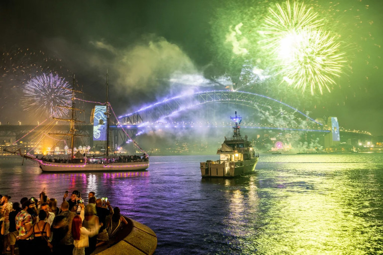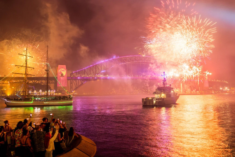 | Toàn cảnh Cảng Sydney vào 9 giờ tối 31/12/2022. |