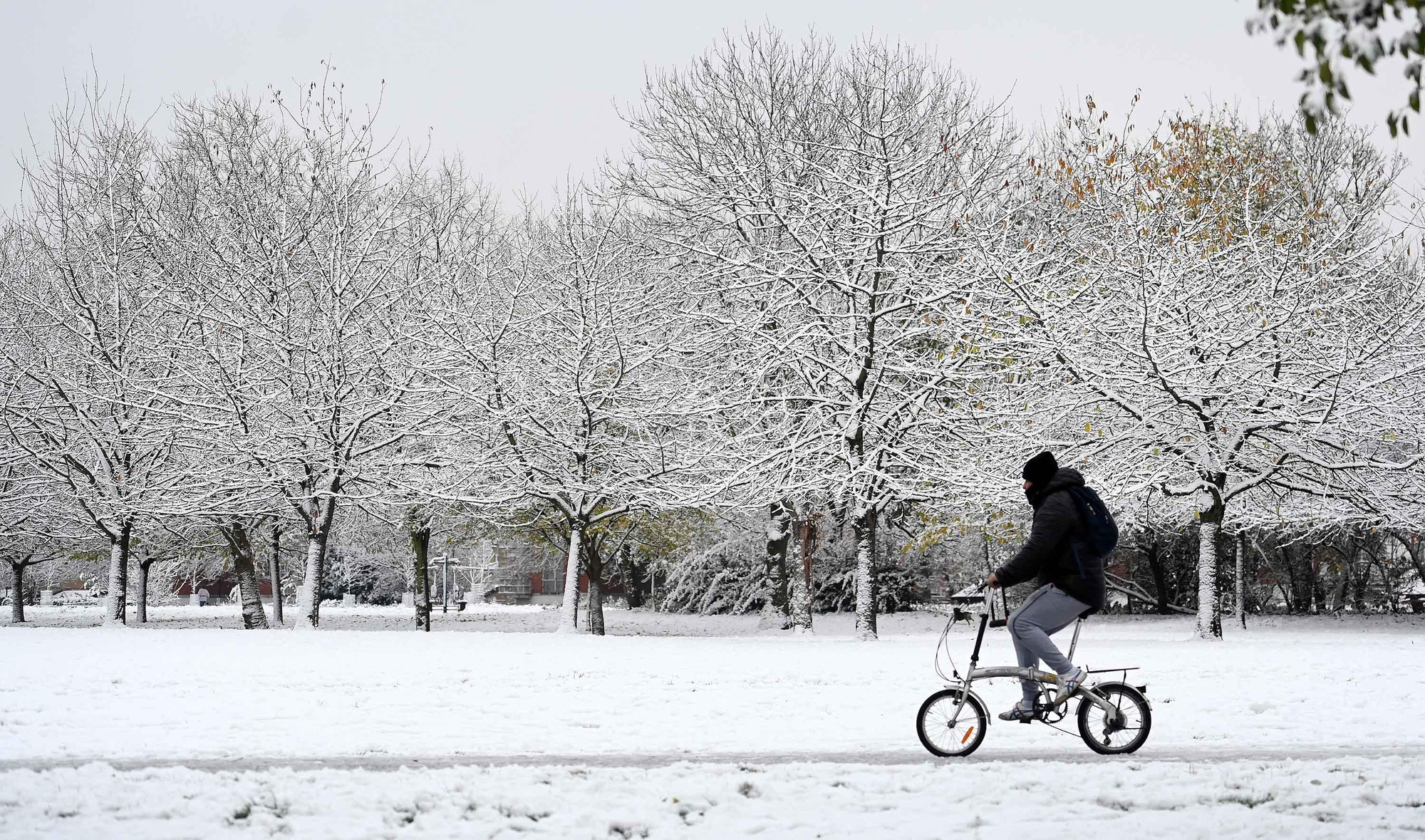 Một người đàn ông đạp xe qua công viên trung tâm London phủ đầy tuyết. (Ảnh: EFE)