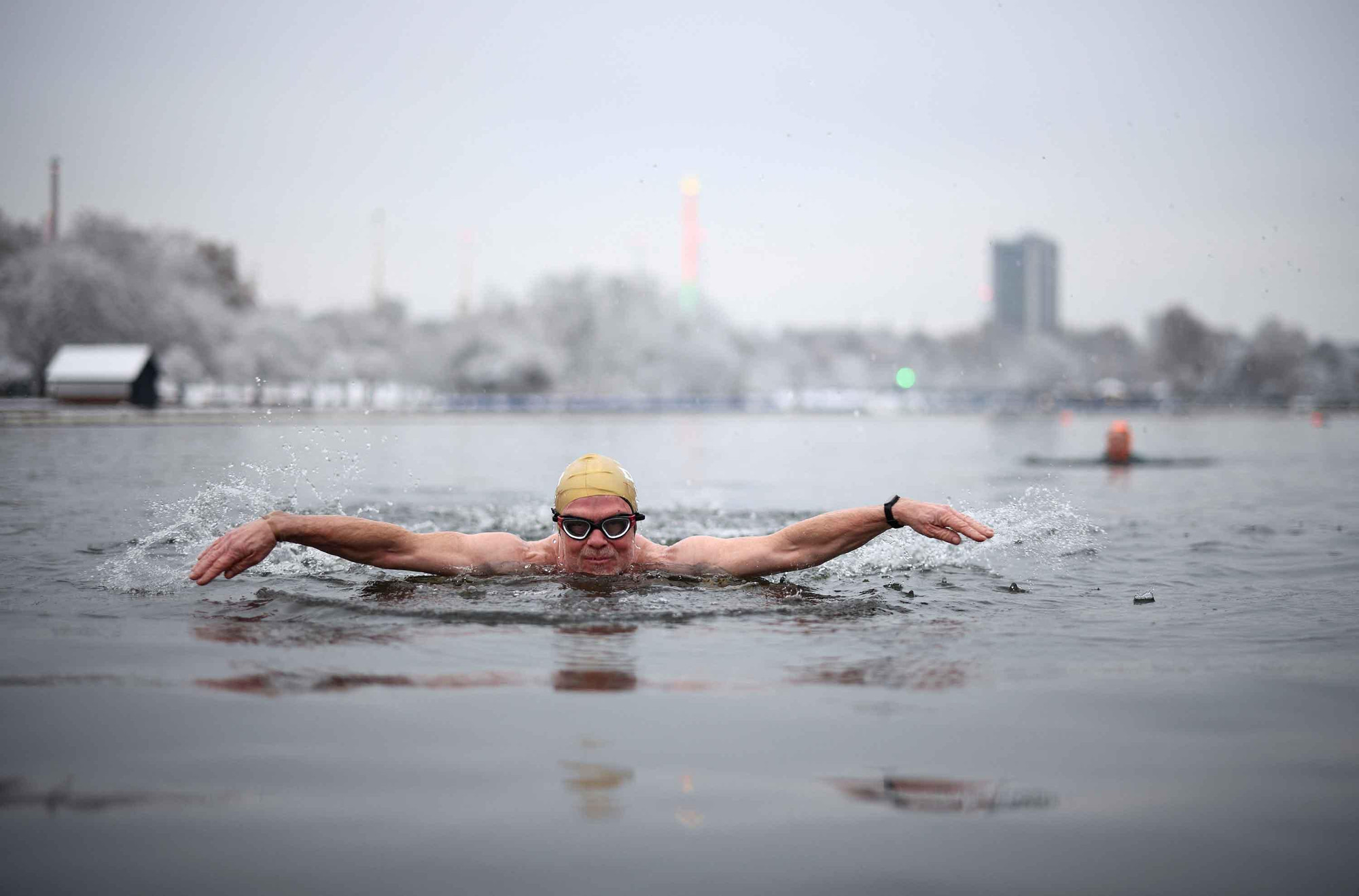 Một người đàn ông bơi ở hồ Sepertine, London, trong khi các nhiệt kế chỉ nhiệt độ -2 độ C. (Ảnh: Reuters)