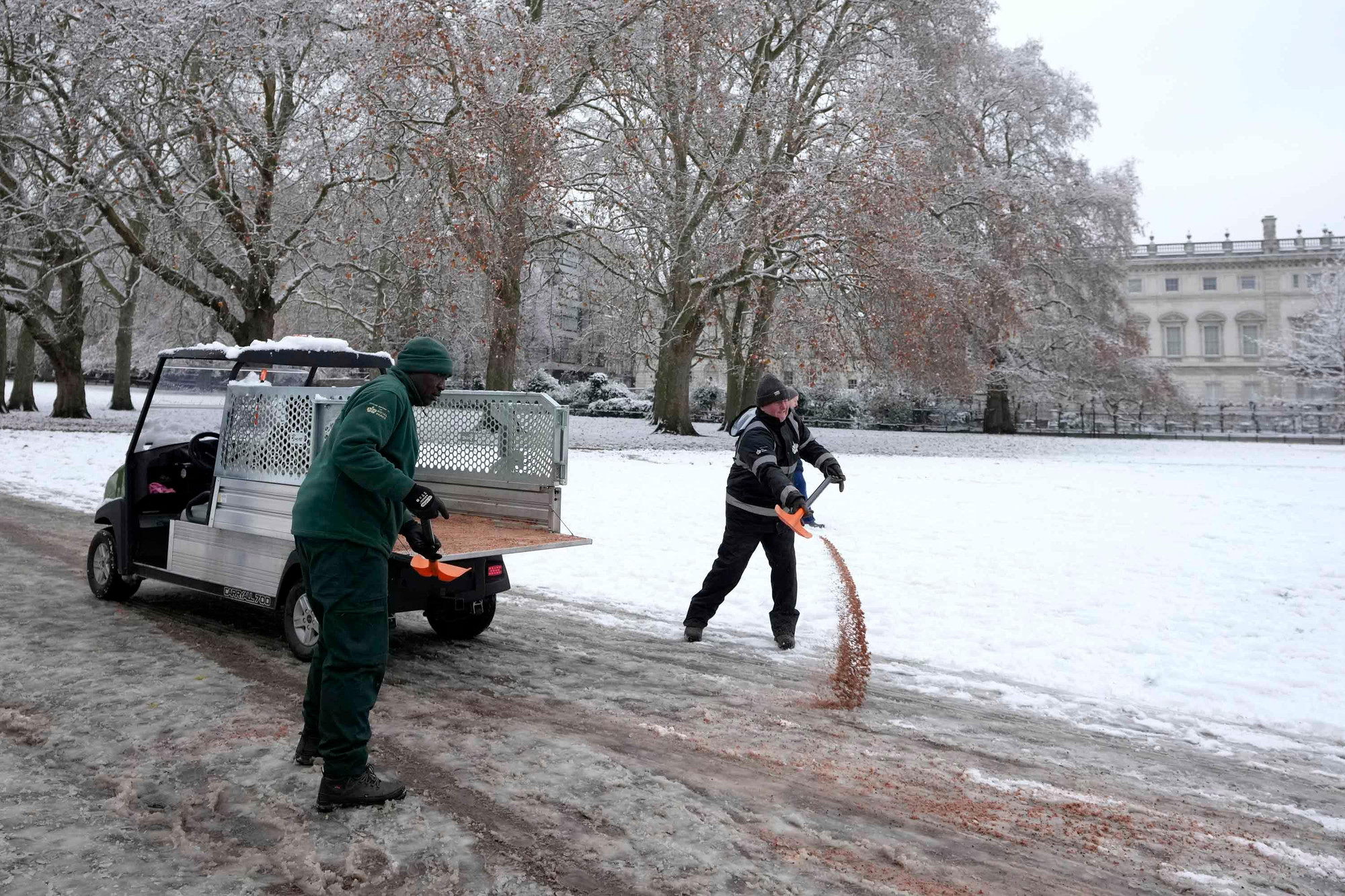 Công nhân Công viên cây xanh rải muối dọc theo một trong những lối đi trong công viên. (Ảnh: AP)