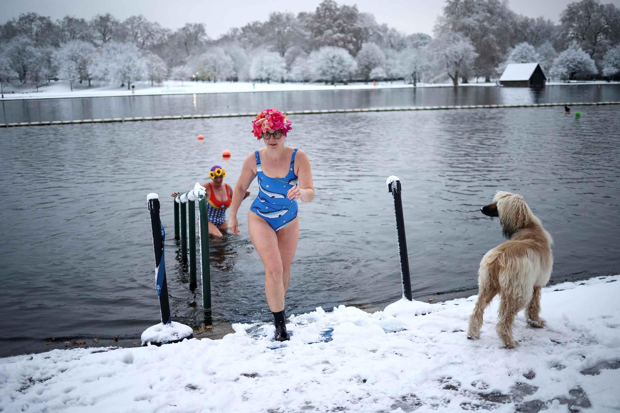 2 phụ nữ đi bơi dưới thời tiết giá lạnh tại hồ Serpentine để rèn luyện sức khỏe và tăng sức chịu đựng cho bản thân. (Ảnh: Reuters)
