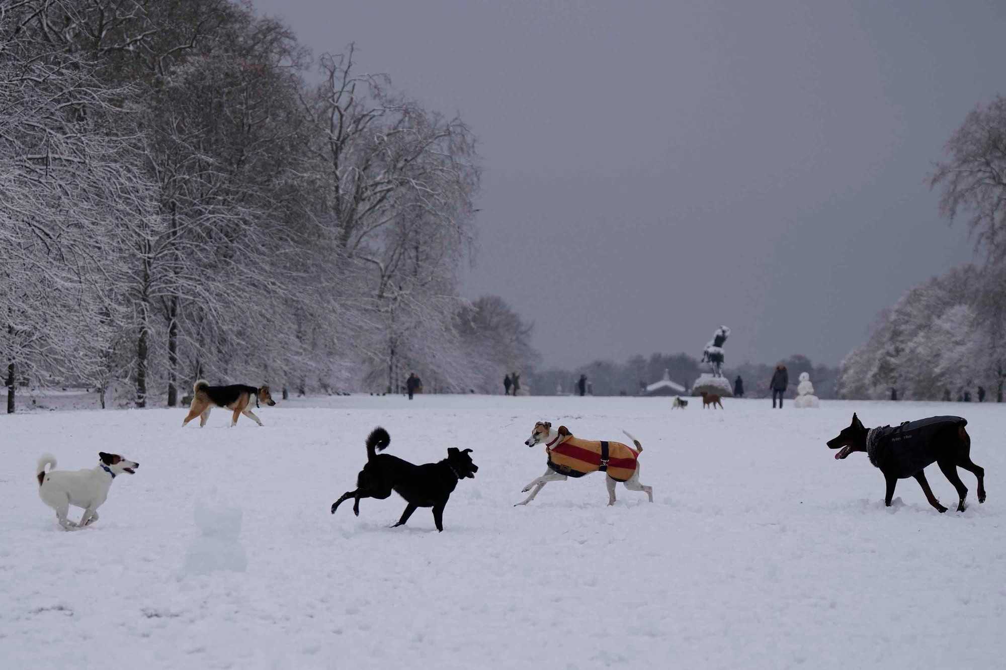 Những chú chó chơi đùa trên thảm tuyết trắng ở công viên Kensington Gardens, London. (Ảnh: AP)
