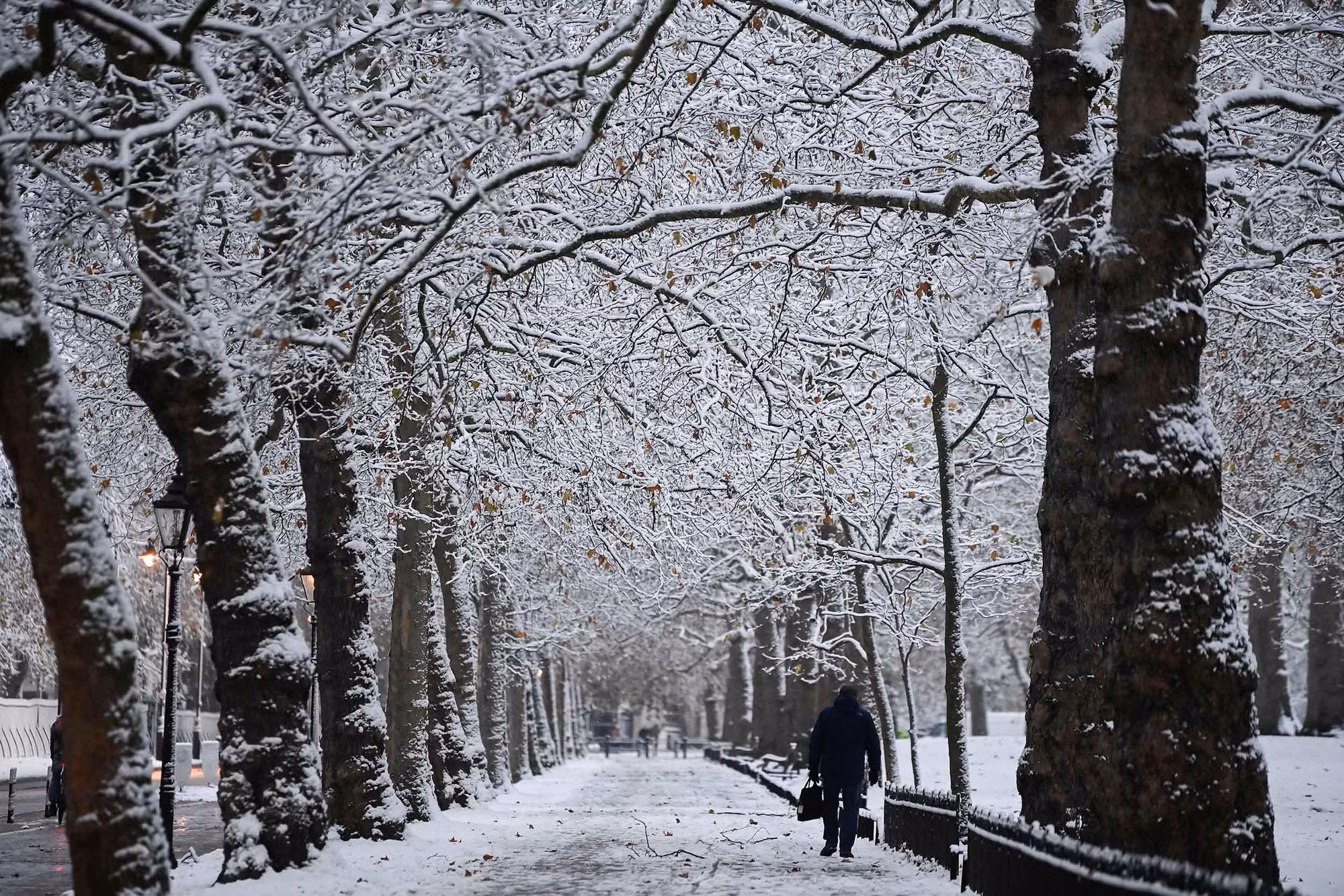 Người đàn ông đi bộ qua công viên phủ đầy tuyết ở London. (Ảnh: Reuters)