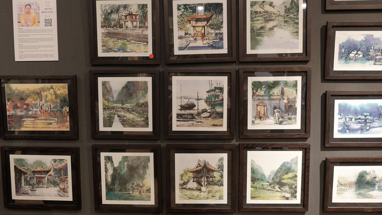 | Họa sĩ Minh Đàm gây ấn tượng với bộ sưu tập tranh màu nước về các danh lam thắng cảnh và di sản. |