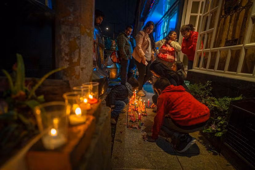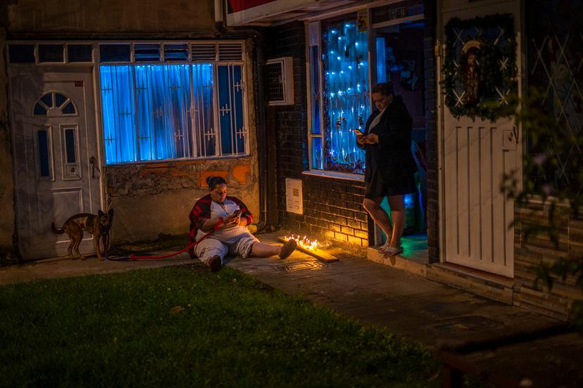 2 người phụ nữ thắp nến trước cửa nhà ở thị trấn Suba, Bogota.