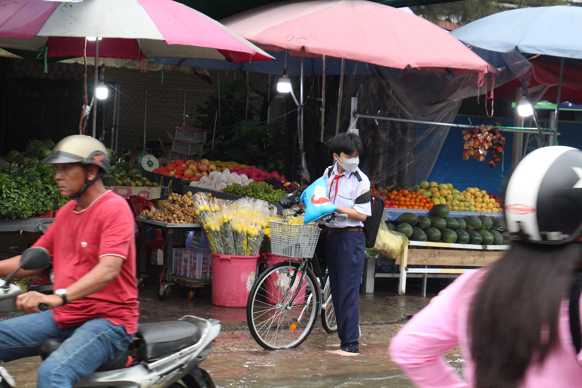 | Để thuận lợi cho việc đi lại khi triều cường dâng cao, người bán hàng rong tranh thủ đi bán hàng rất sớm. |