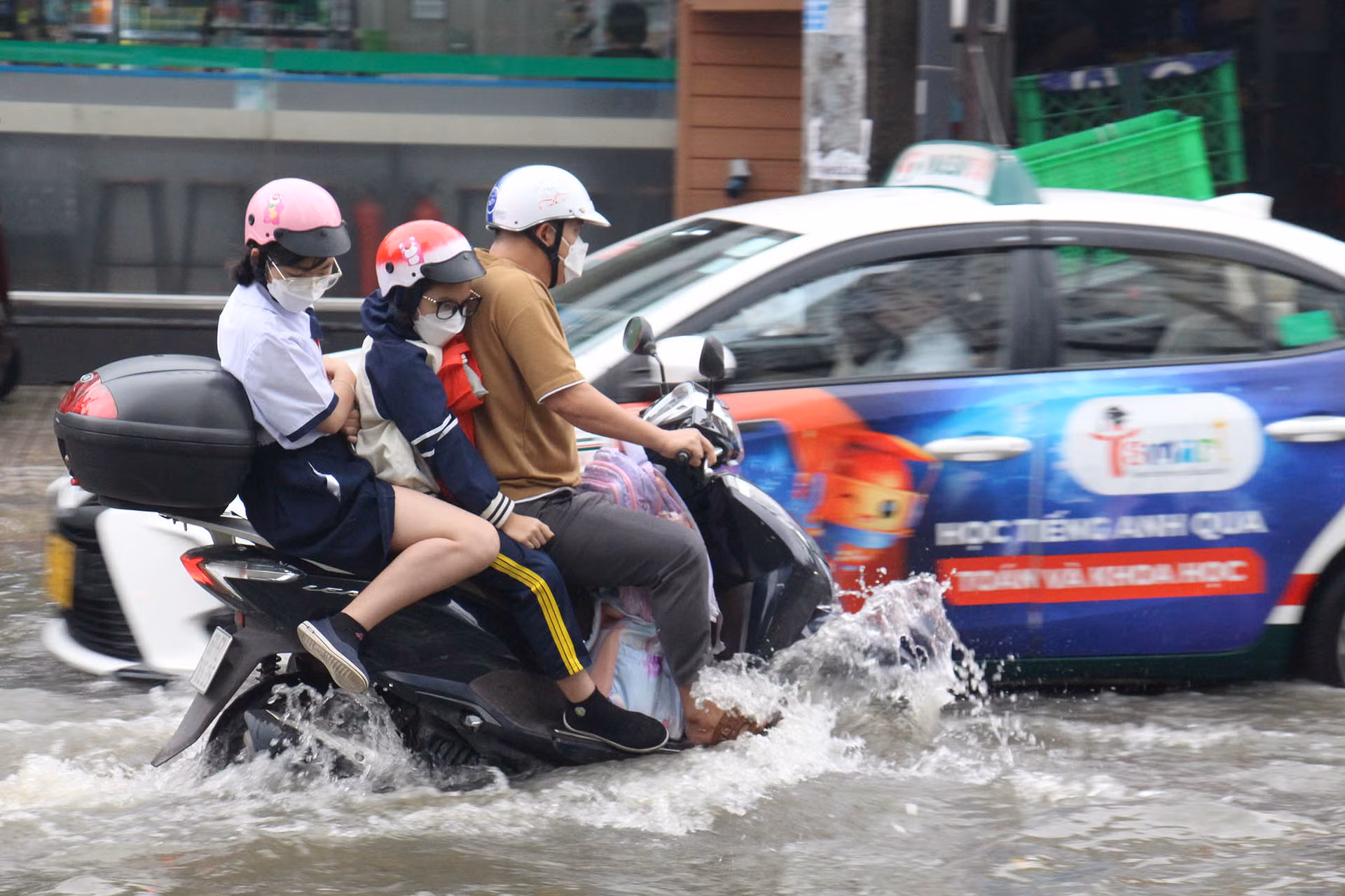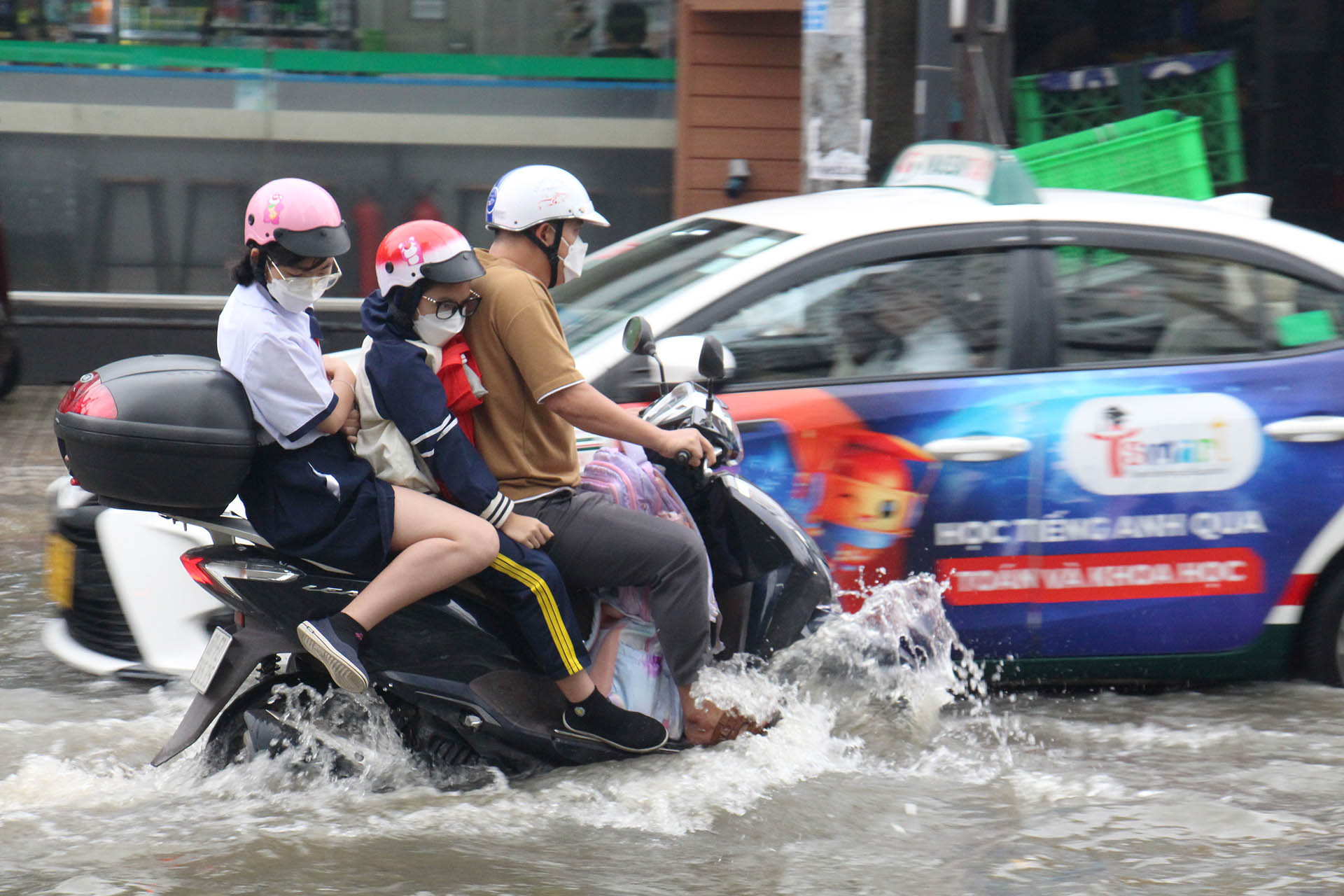 | Phụ huynh và học sinh vất vả di chuyển qua các điểm ngập. |