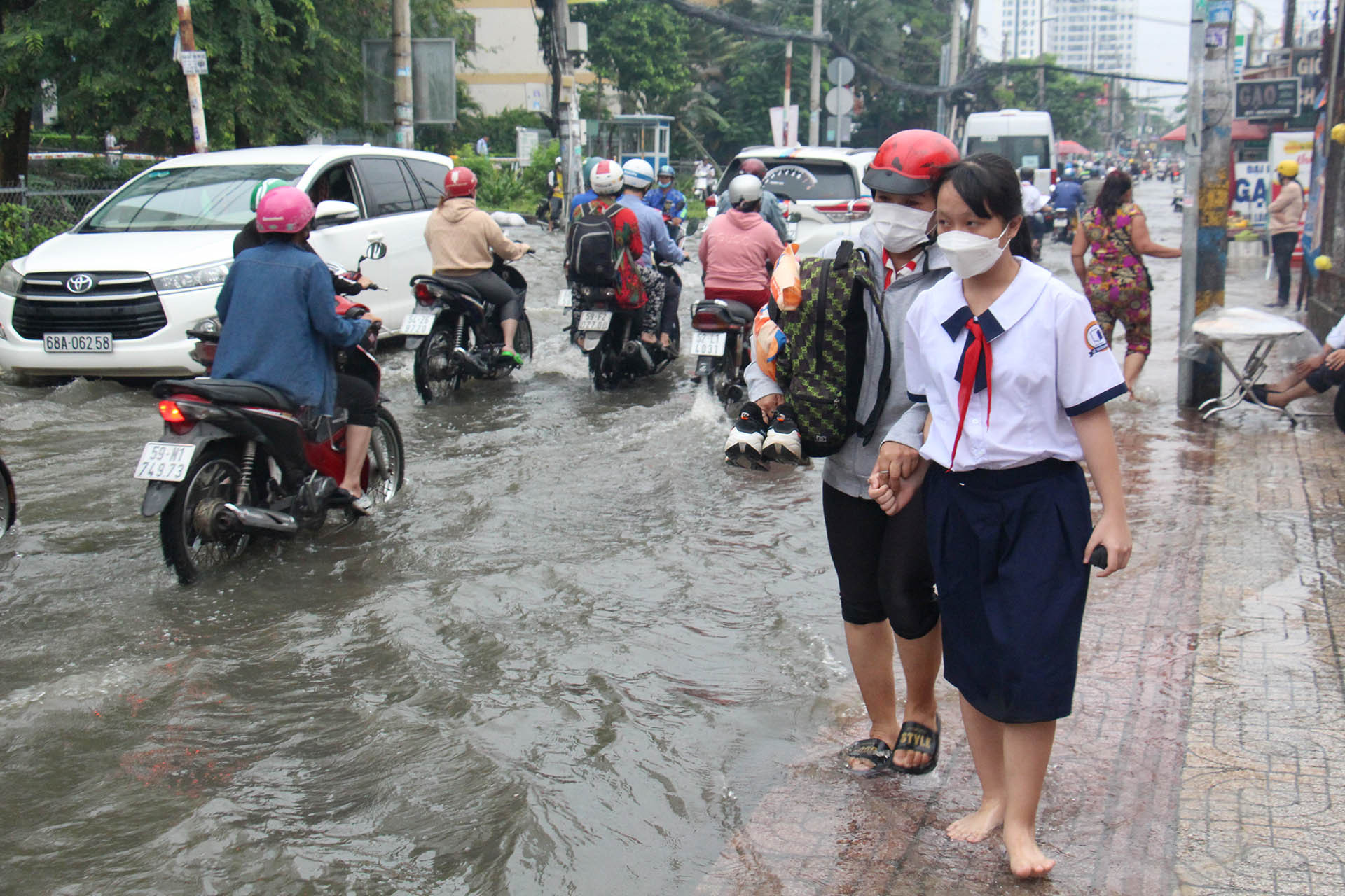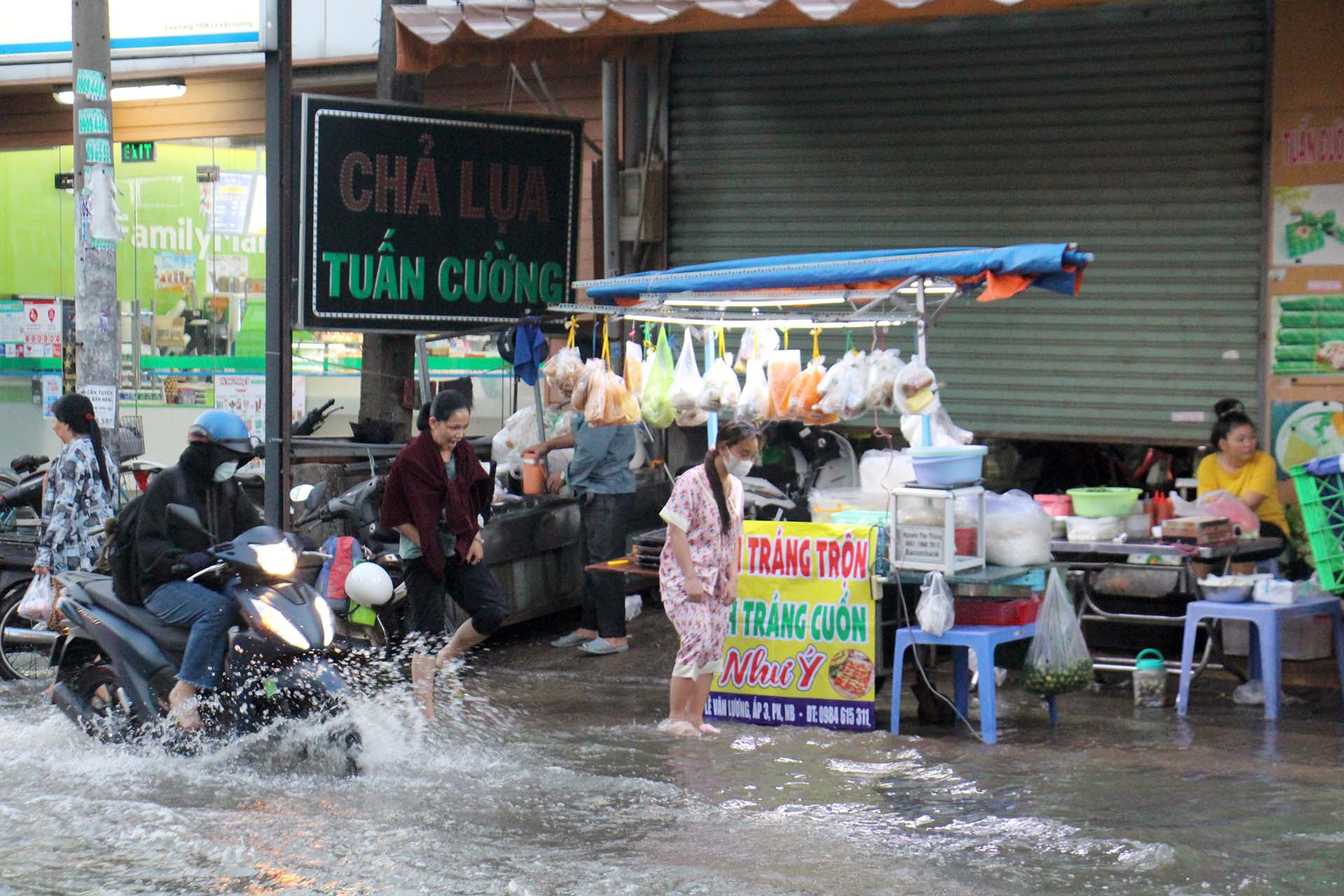 | Đường Lê Văn Lương, nước ngập liên tục nhiều ngày khiến việc buôn bán ế ẩm, người dân đi lại khó khăn, học sinh té ngã khi qua đoạn ngập sâu. |