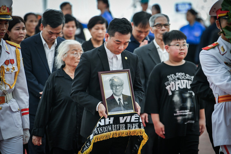 | Nhiều người đã mang theo di ảnh của Tổng Bí thư trên hành trình viếng. |