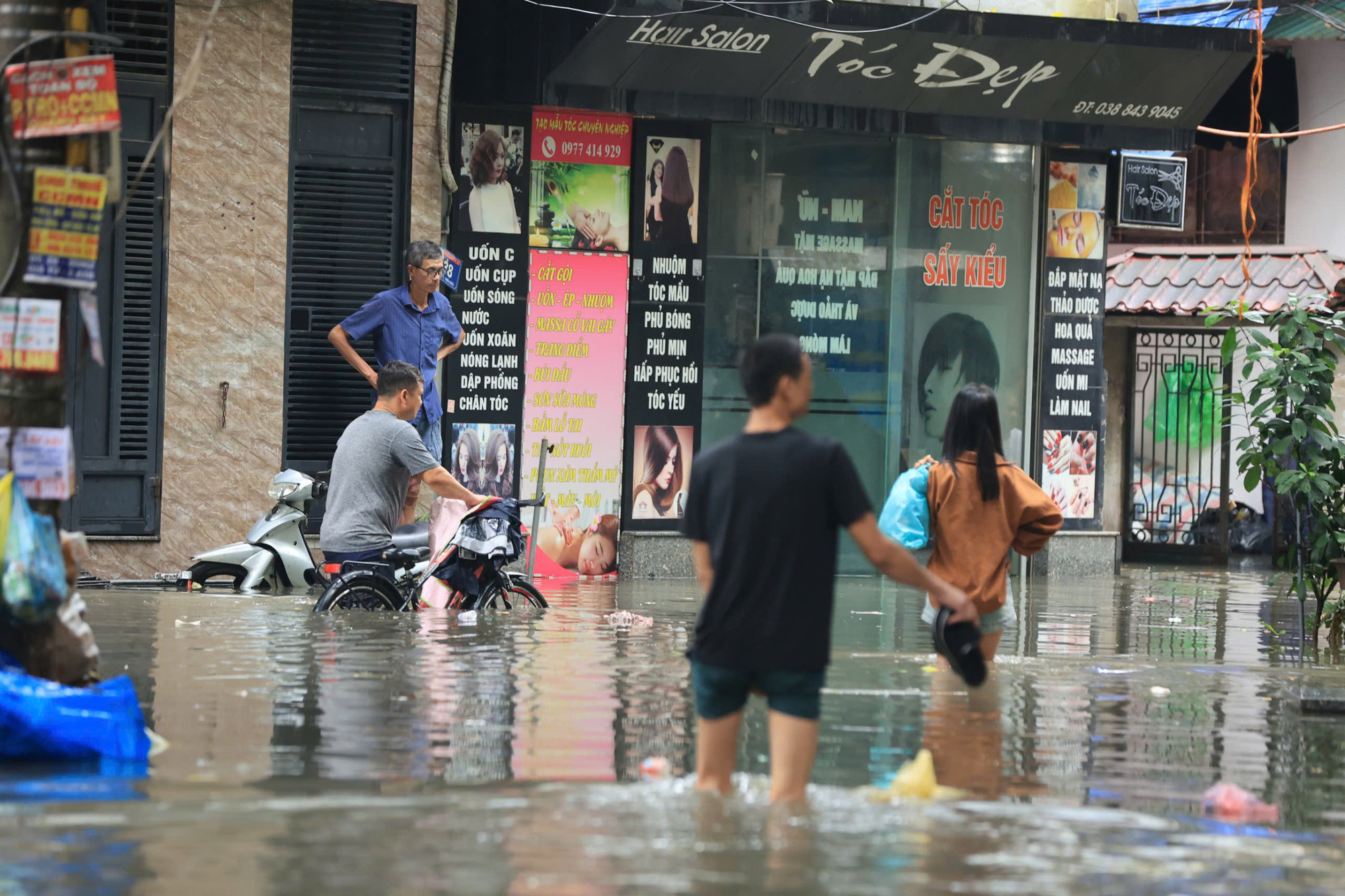 | Mưa lớn kéo dài đã khiến cho nhiều tuyến đường ngập nặng. Trong ảnh, người dân di chuyển khó khăn qua ngõ 111 Triều Khúc (Thanh Xuân, Hà Nội) |