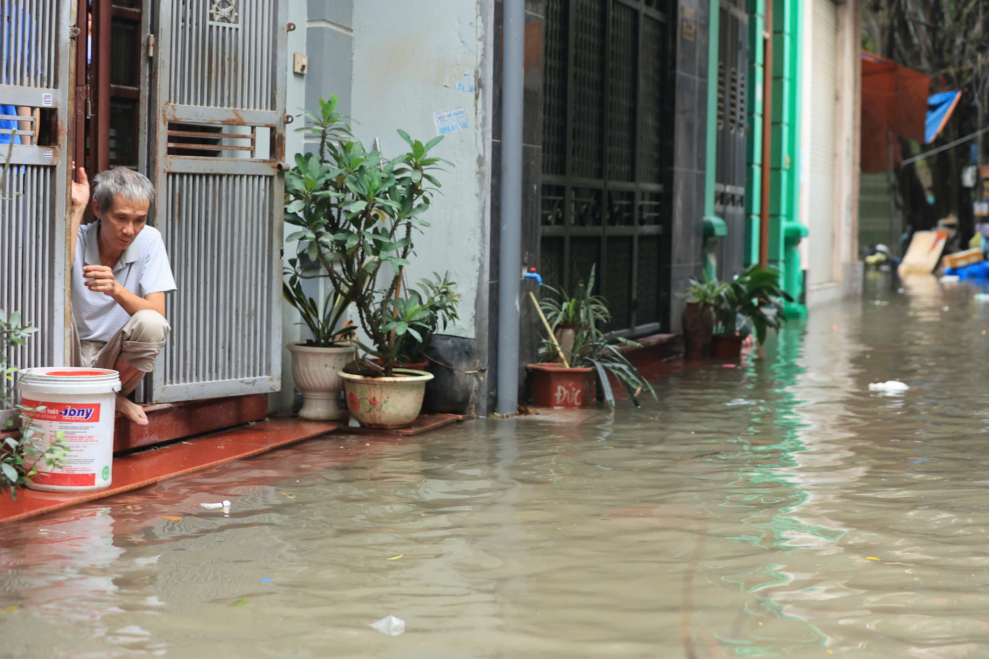 | Cũng tại ngõ 111 Triều Khúc, nhiều đoạn nước ngập đến gần yên xe máy. |