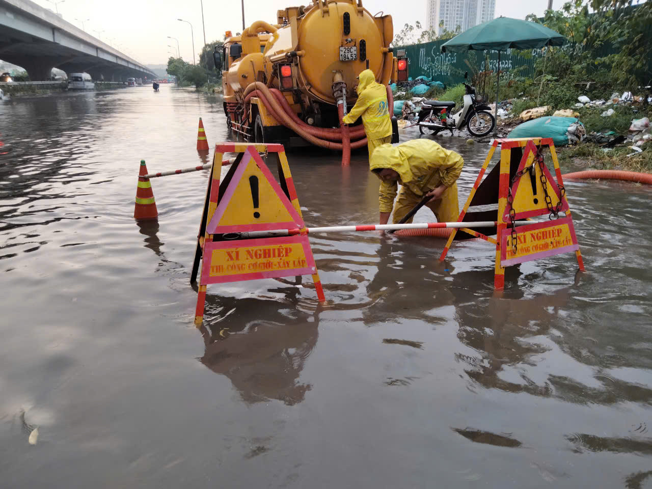| Công nhân thoát nước ứng trực tại đường Nguyễn Xiển. |