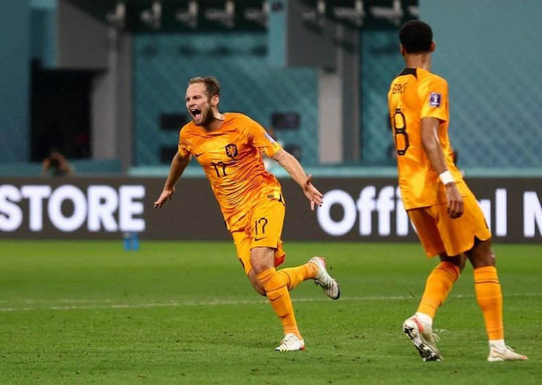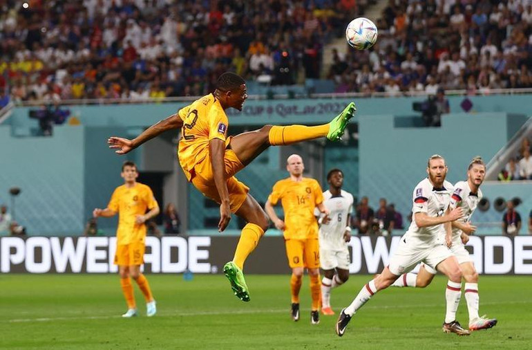 Denzel Dumfries ăn mừng sau khi ghi bàn thắng ấn định tỷ số 3-1 cho đội tuyển Hà Lan trong trận gặp Mỹ ở vòng 1/8 World Cup 2022. (Ảnh: Reuters)