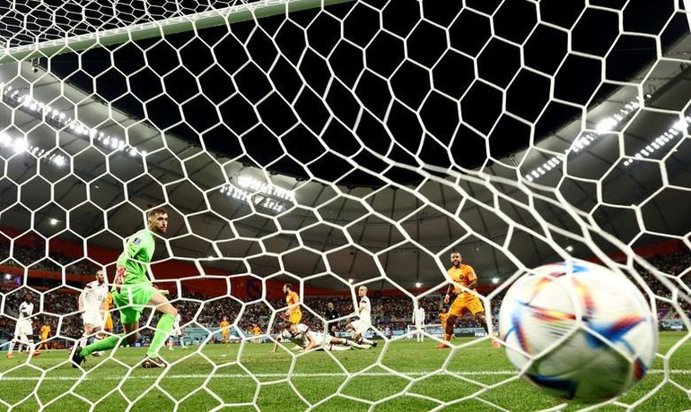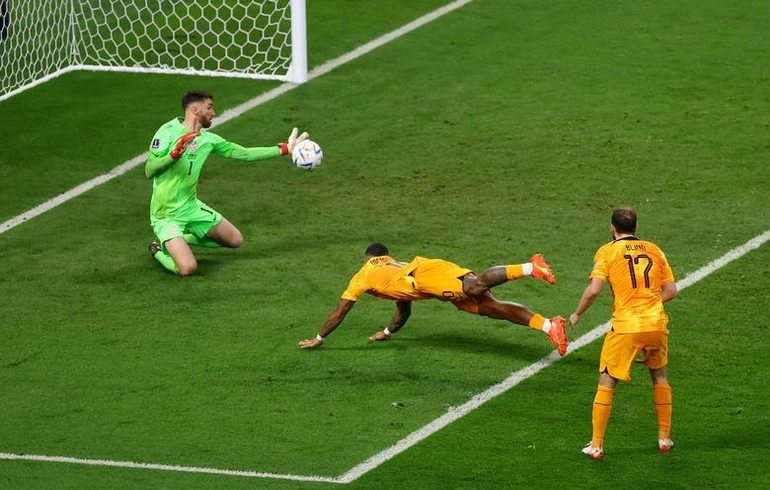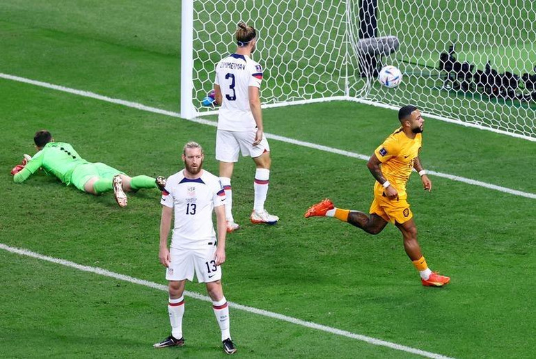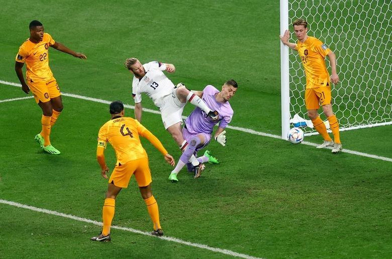Tim Ream (Mỹ) tung cú dứt điểm đánh bại thủ thành Andries Noppert của Hà Lan, song tiền đạo Cody Gakpo đã kịp thời phá bóng ngay trước vạch vôi. (Ảnh: Reuters)