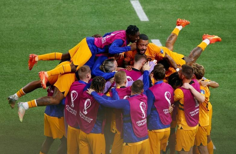 Niềm hân hoan của Memphis Depay và đồng đội khi Hà Lan giành vé vào tứ kết World Cup 2022. (Ảnh: Reuters)