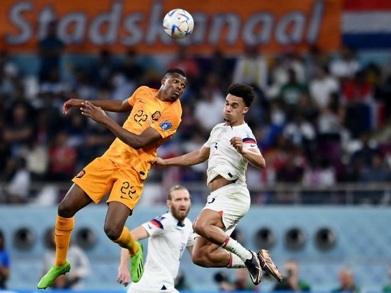 Tình huống “không chiến” giữa Denzel Dumfries (Hà Lan) và Antonee Robinson (Mỹ). (Ảnh: Reuters)